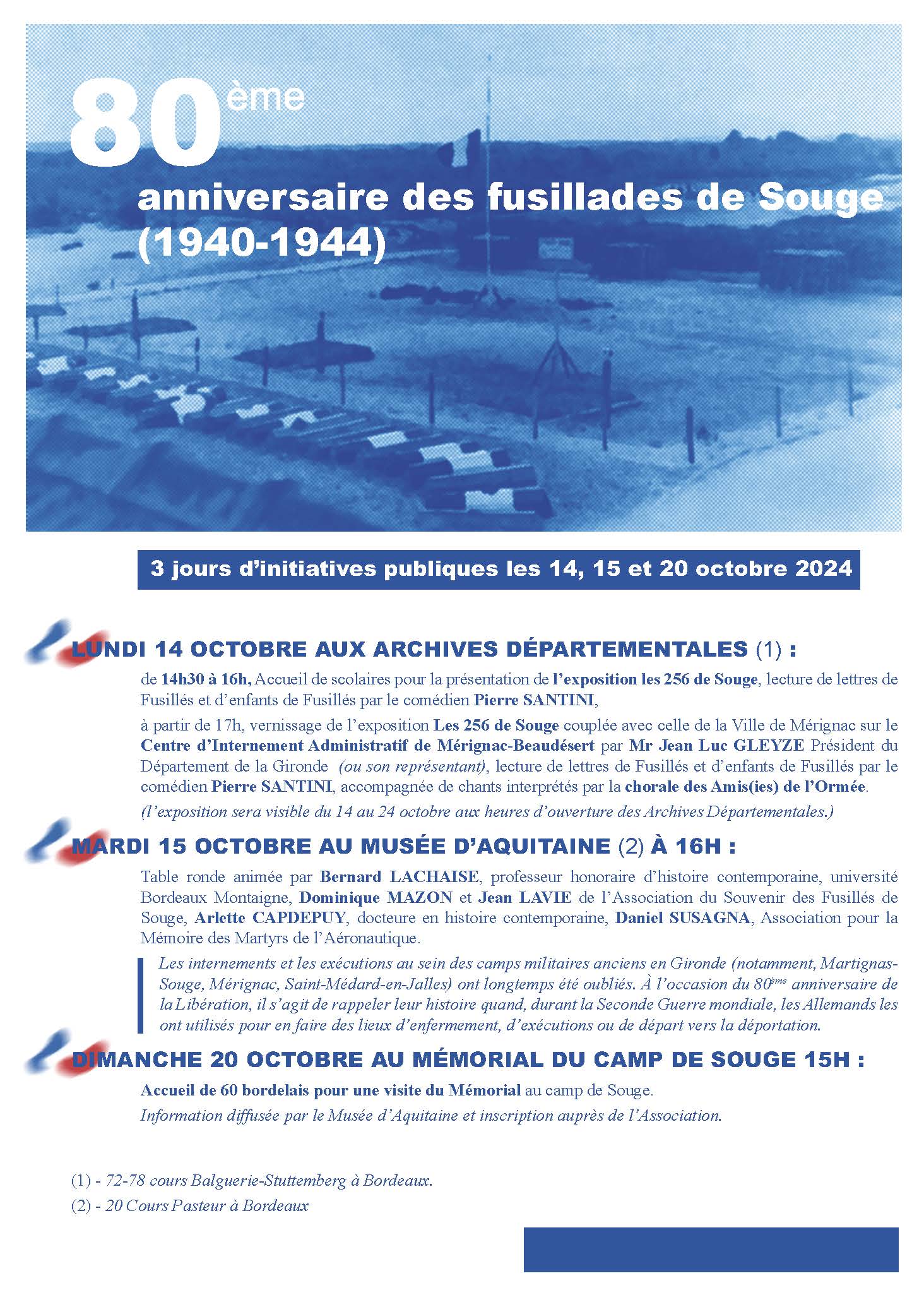 Il nous a semblé en effet que la clôture du cycle du 80 ème anniversaire des fusillades s’échelonnant de 2021 à 2024 méritait une série d’initiatives permettant à tout un chacun et aux girondins en particulier de découvrir et/ou mieux connaître les évènements dramatiques qui se sont déroulés au camp militaire de Souge situé sur les 3 communes de Martignas, St Médard et St Jean d’Illac durant la guerre entre 1940 et 1944.