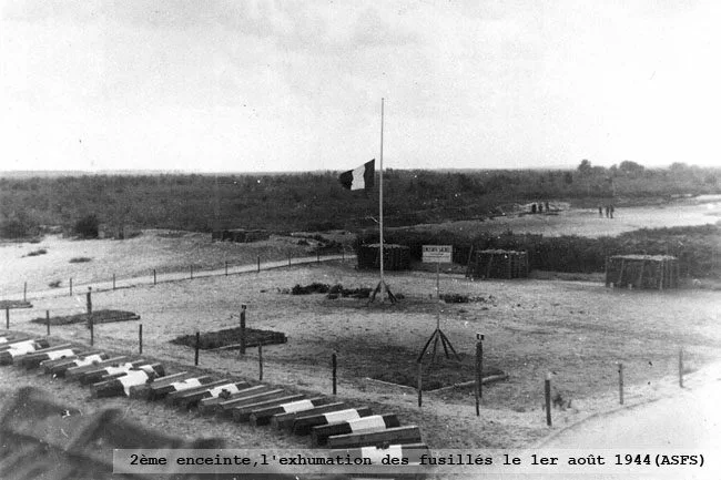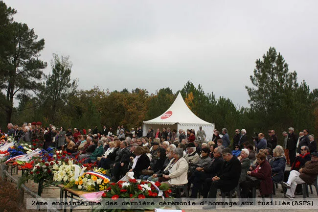 Diaporama ci-contre : 1ère photo l'enceinte lors de l'exhumation des fusillés du 1° août 1944, 2ème photo une des dernières cérémonie d'hommage aux fusillés.