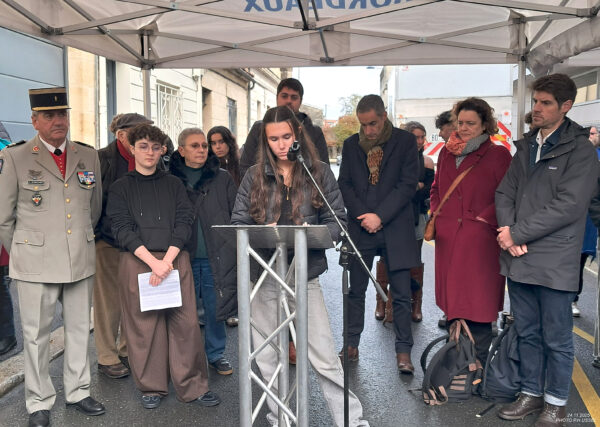 Bonjour à toutes et à tous, je m'appelle Yaëlle et je suis en classe de Terminale. Moi et mes camarades ici présents, nous représentons aujourd'hui l'ensemble du lycée François Magendie. Personnellement, je ne connaissais ni l'histoire de Georgette et Robert Bret, ni celle de mon quartier, ni celle des évènements qui s'y sont déroulés il y a près de 80 ans. Grâce au travail des associations et notamment celui de l'Association du souvenir des fusillés de Souge que nous avons eu la chance de rencontrer et avec laquelle nous avons pu interagir, nous avons eu la possibilité d'accéder à des archives et à des documents d'époque qui nous ont permis d'en apprendre plus sur l'histoire de notre quartier qui nous étaient méconnus. Nous tenons également à remercier la mairie de Bordeaux pour tout le travail réalisé afin d'entretenir, de préserver et surtout de partager cette mémoire locale. Ce travail de mémoire nous tient particulièrement à cœur car en tant que citoyens en devenir et étudiants à Bordeaux, il est dans notre devoir d'entretenir la mémoire pour continuer à honorer afin de ne jamais oublier.